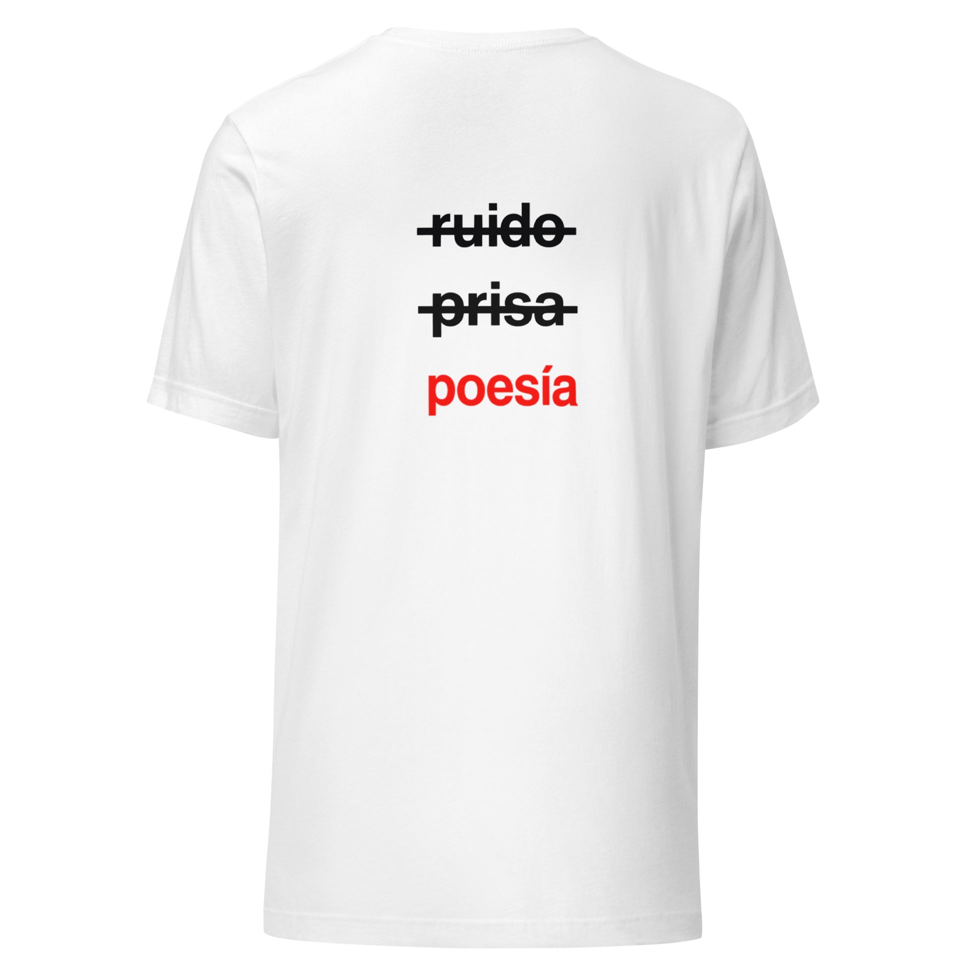 La camiseta Poesía es un statement minimalista: tipografía en rojo intenso sobre blanco editorial, un contraste que transforma lo cotidiano en manifiesto cultural.